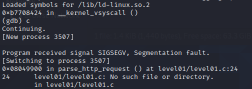 In a real environment, SSH access to the machine would not be granted but taking into consideration this is an exercise, we can connect to the machine and use GDB to attach to the running process, serving the requests from level01.