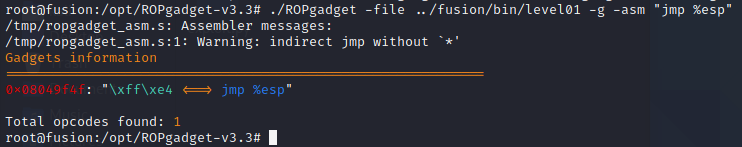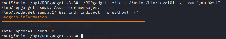 Now we need to do some ROP. We have the information that ESI contains the address we need to jump to. This means that we could overwrite the return address with the address of “JMP ESI” instruction if it exists. There is a neat tool that comes preinstalled on Fusion machine called “ROPgadget”, installed in the “/opt” directory. This tool can be used to scan a binary for strings, opcodes or instructions and if found, gives us their location in memory.