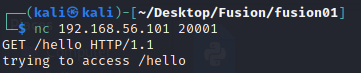 The program is called by connecting to the VM on port 20001. After correctly formatting the input as the deducted from the given source code, a message “trying to access <path>” is shown.